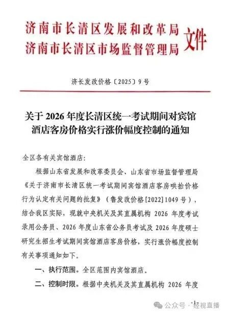 记者就此事关连济南市长清区市集监督科罚局。责任主说念主员暗示,长清大学城临近每年考研时辰价钱涨幅权贵,为此,长清区发改委和市集监管局已于本年11月26日邻接印发《对于2026年度长清区息争历练时辰对宾馆酒店客房价钱践诺加价幅度限定的示知》,明确功令,酒店价钱以11月7日至9日同等房型、同等劳动的平均来去价钱为基准,上浮幅度不得跳动100%。